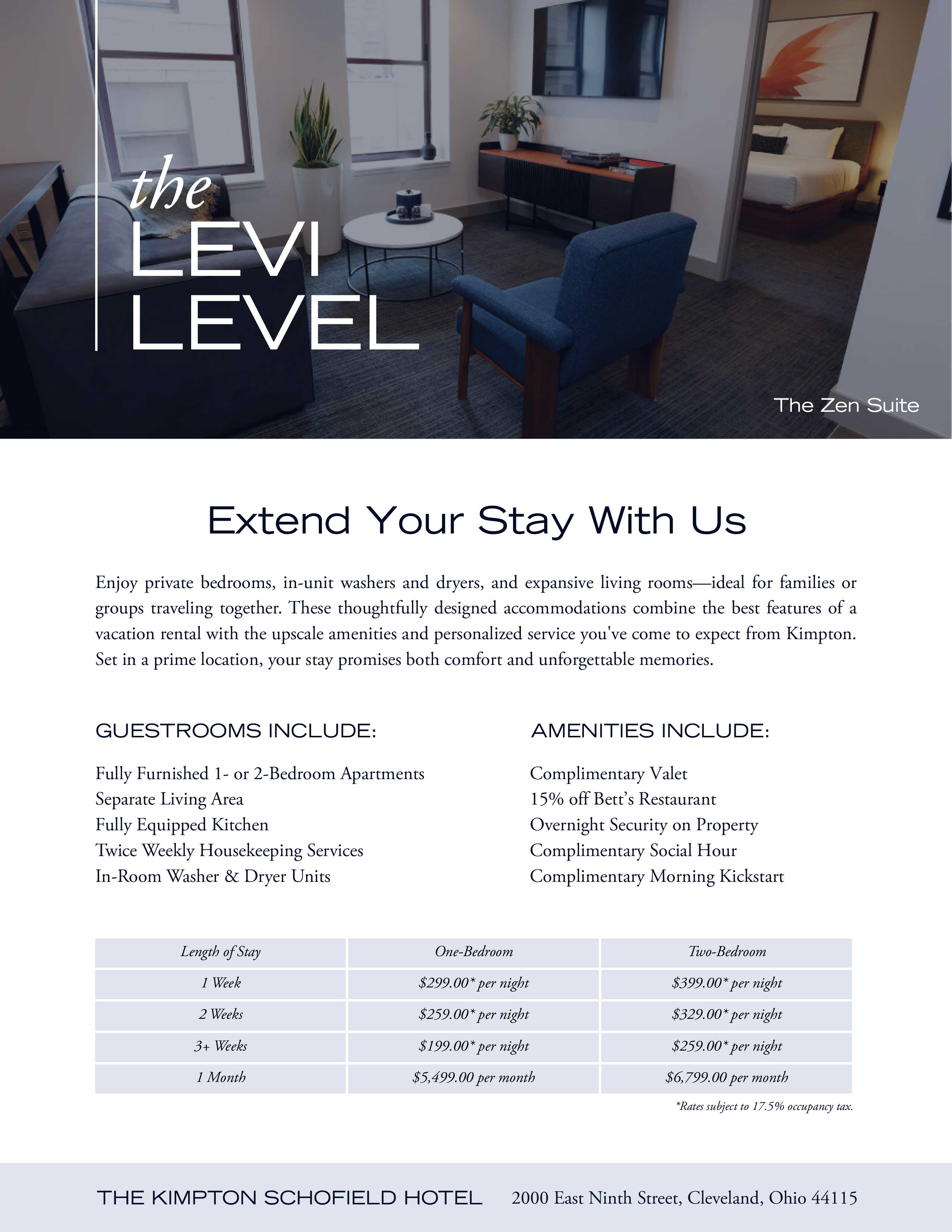 For weekly to monthly rates, please reach out to Jena Salupo at sales@theschofieldhotel.com or at 440-730-5636